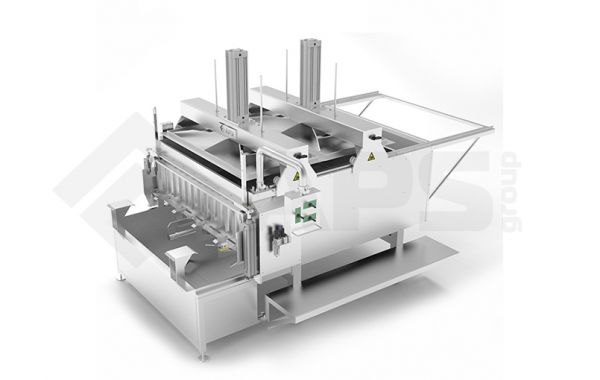При этом пласт проходит ножи продольной резки и разрезается на полосы заданной ширины. При выдвижении продукта на необходимую длину подача останавливается и стенка-нож, опускаясь, разрезает пласт в поперечном направлении.